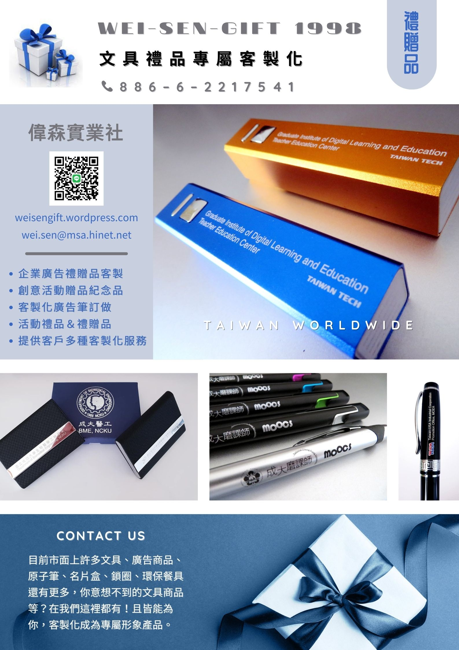 WEI SEN GIFT 專精各類禮贈品的規劃與銷售,代理各大知名品牌禮品贈品。目前專為大專院校與學術單位、股票上市上櫃公司、政府機關團體、人民團體與公會&工會、一般公司行號、一般禮品贈品公司提供多元化的服務。秉持一貫原則提供你最熱忱服務,最專業精神及不斷創新為目標,以客戶訴求為導向服務客戶為目的,讓客戶能以最少的成本得到最大的效益。更值得一提的是目前 WEI SEN GIFT 與各國立大學與專科學校合作過,無數研討會紀念品與畢業生紀念品的參與及製作均獲得相當的好評~